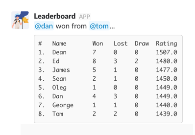 Slash Leaderboard, followed by enter đĽ. And here it is⌠everyoneâs position on the leaderboard together with their ELO rating.